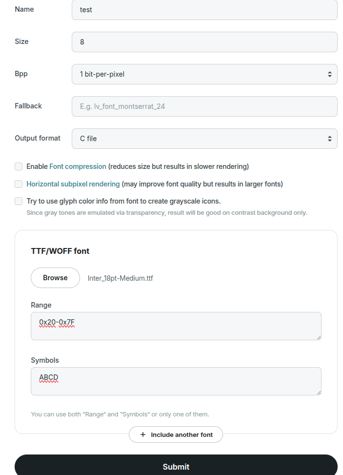 But if I also set font range or font characters then the converter works fine. Like in this picture: