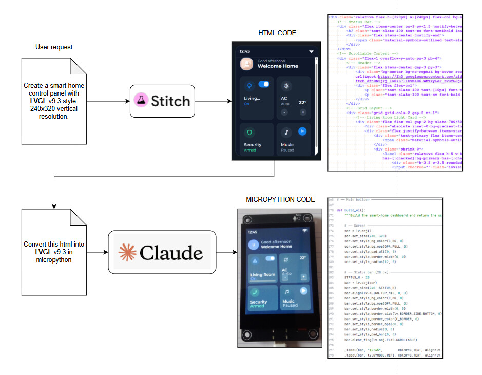 Just testing this Google AI tool named Stitch to generate UIs. You give the description and it creates a set of UI screens, just as any other AI tool can do, but the difference is that they are in HTML, not images, so you can export to figma or other tools, or translate to a different languages with more AI. In the example I show in the image, I used Claude to convert the HTML to LVGL v9.3 in MicroPython.