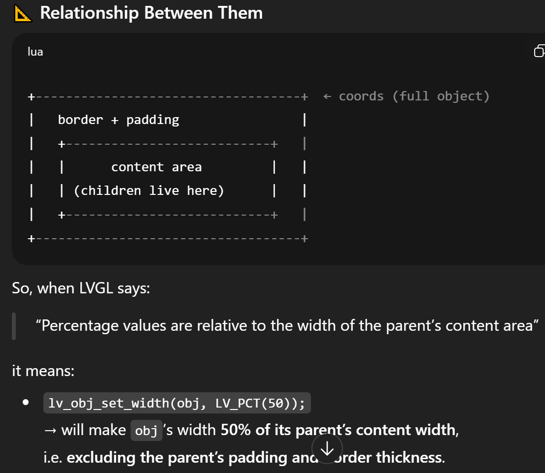 I’ve tried searching the documentation and the forums but I can’t find anything concrete. The closest I’ve gotten is LV_PCT() but I am not sure whether that means 100% of the content area for 100% of the child widget’s content width.